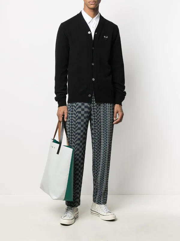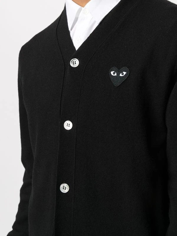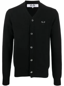 Maille fine, col v, boutonnière sur le devant, patch logo sur le devant, manches longues, poignets nervurés, ourlet nervuré. Couleur : noir. Matière : laine.
