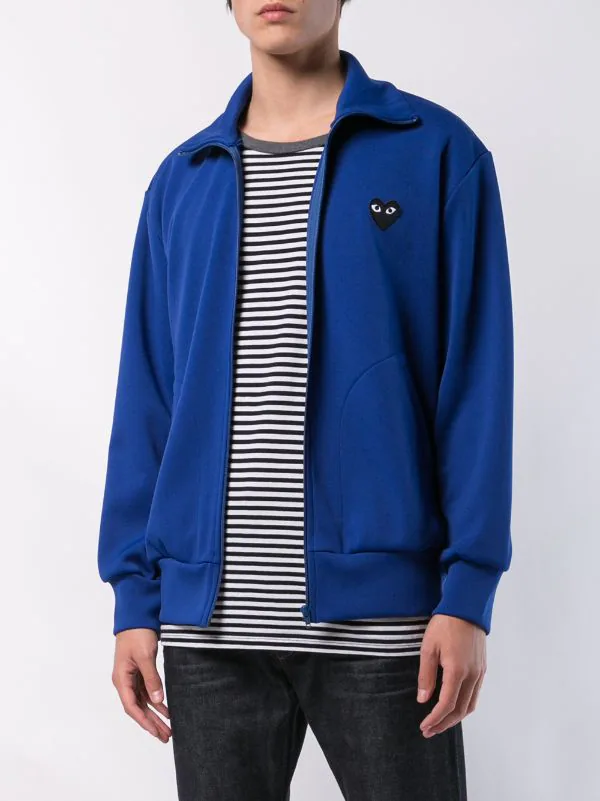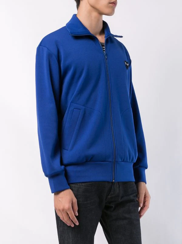 Sweat zippé bleu roi à logo poitrine Comme Des Garçons Play avec fermeture zippée devant, manches longues, ourlet et poignets nervurés, poches devant, patch logo sur le devant et logo imprimé à l’arrière.