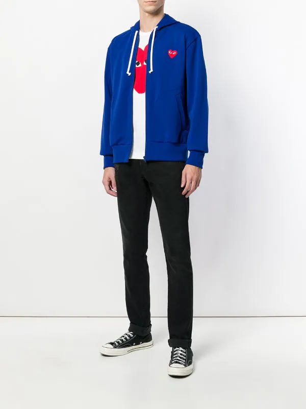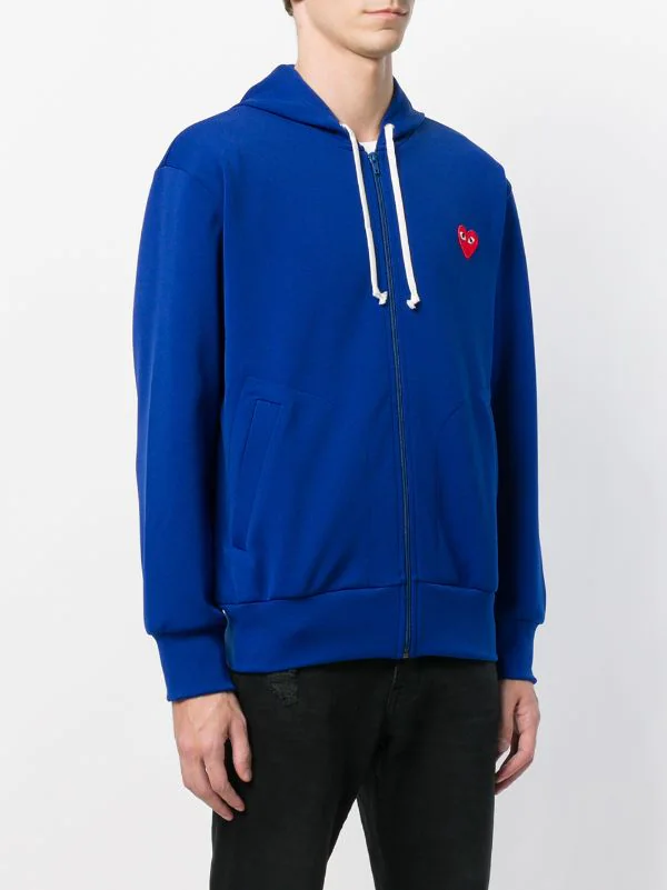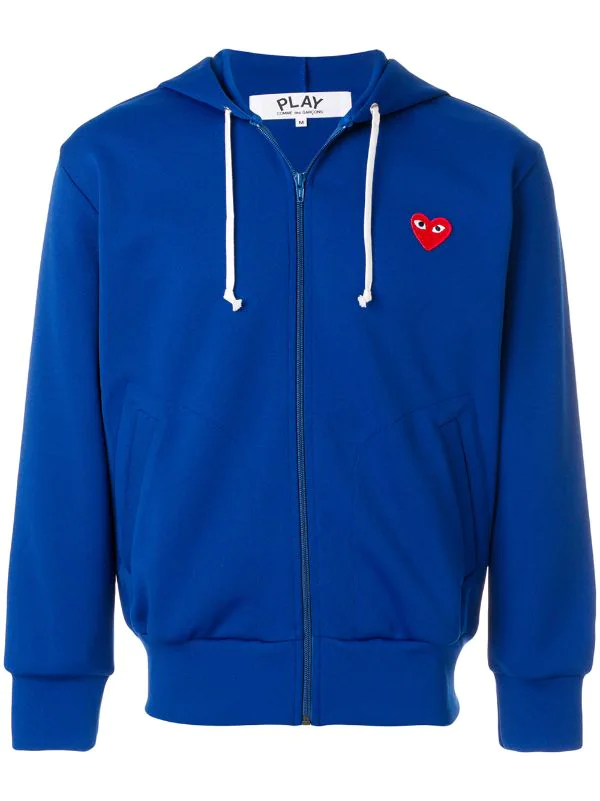 Sweat zippé bleu cobalt à logo poitrine Comme Des Garçons Play avec manches longues, fermeture zippée devant, capuche à lien de resserrage, poches devant, ourlet et poignets nervurés et logo poitrine.