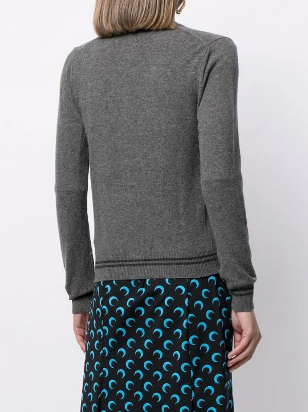Logo brodé, encolure ronde, détail nervuré, boutonnière sur le devant, manches longues, détails rayés. Couleur : gris. Matière : laine.