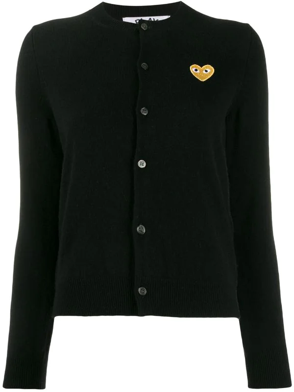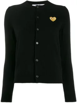 Cardigan à patch cœur en laine Comme Des Garçons Play avec encolure ras du cou nervurée, boutonnière sur le devant, manches longues, ourlet et poignets nervurés et ourlet droit. Couleur : noir.
