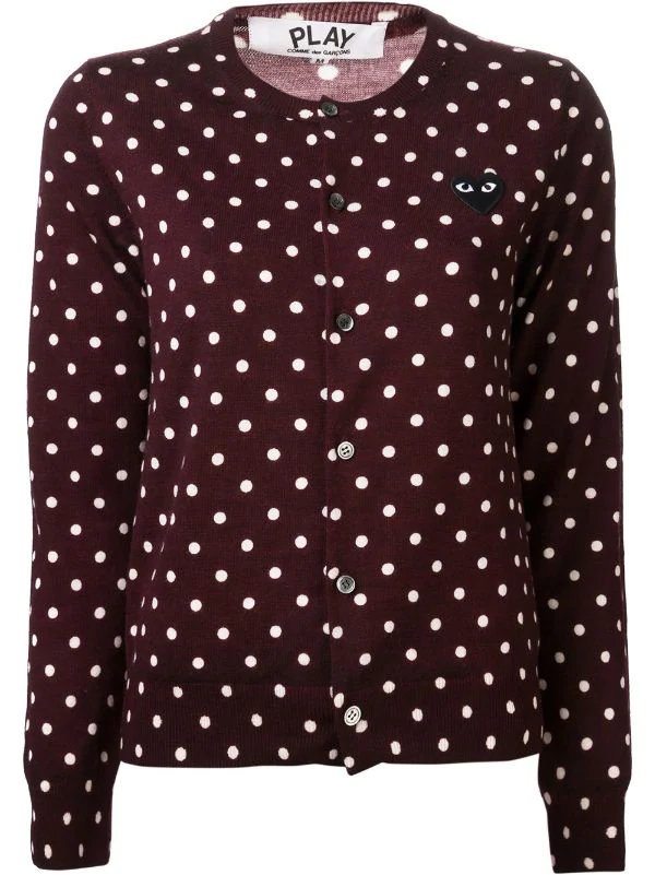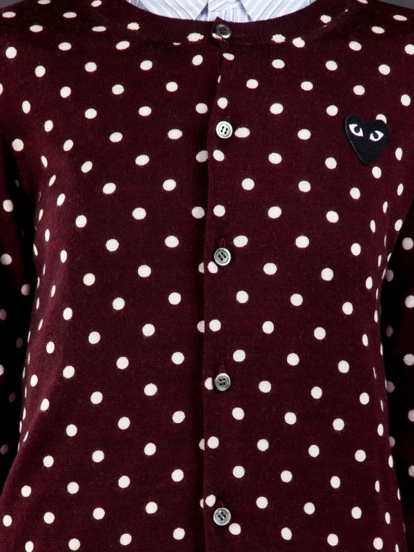 Cardigan à pois et patch logo coeur en laine bordeaux et blanc Comme Des Garçons Play.