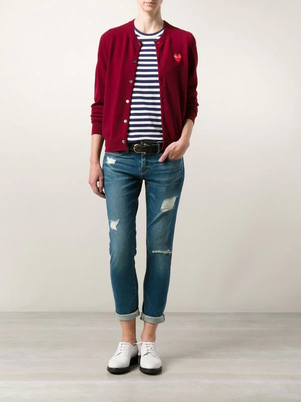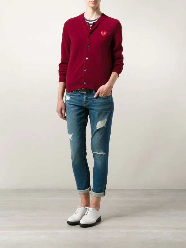 Cardigan classique en laine bordeaux Comme Des Garçons Play avec encolure ras du cou en bord-côte, boutonnière sur le devant, logo contrastant brodé sur la poitrine, manches longues et ourlet et poignets nervurés.