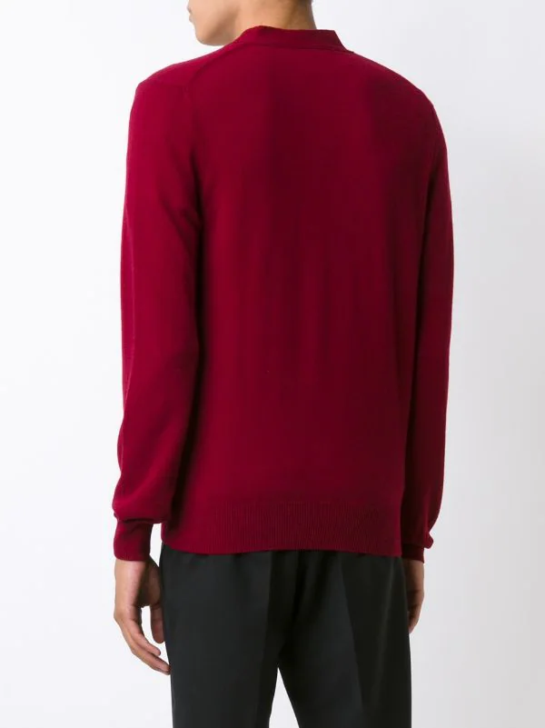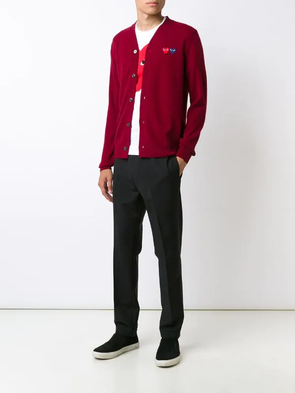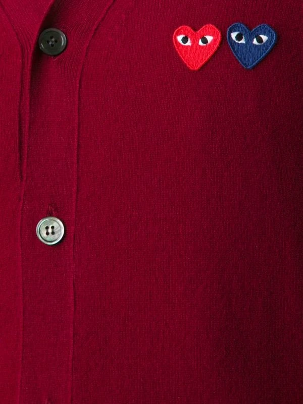 Cardigan « Double Heart » en laine rouge bordeaux Comme Des Garçons Play.