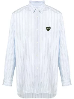 Chemise rayée à patch logo poitrine en coton Comme Des Garçons Play avec col boutonné, rayures verticales, patte de boutonnage sur le devant, manches longues, poignets boutonnés et ourlet incurvé. Couleur : bleu.