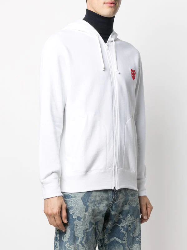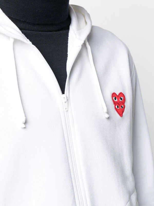 Cœur rouge signature brodé, capuche à lien de resserrage, fermeture zippée devant, manches longues, poignets nervurés, ourlet nervuré, deux poches latérales passepoilées. Matière : coton.