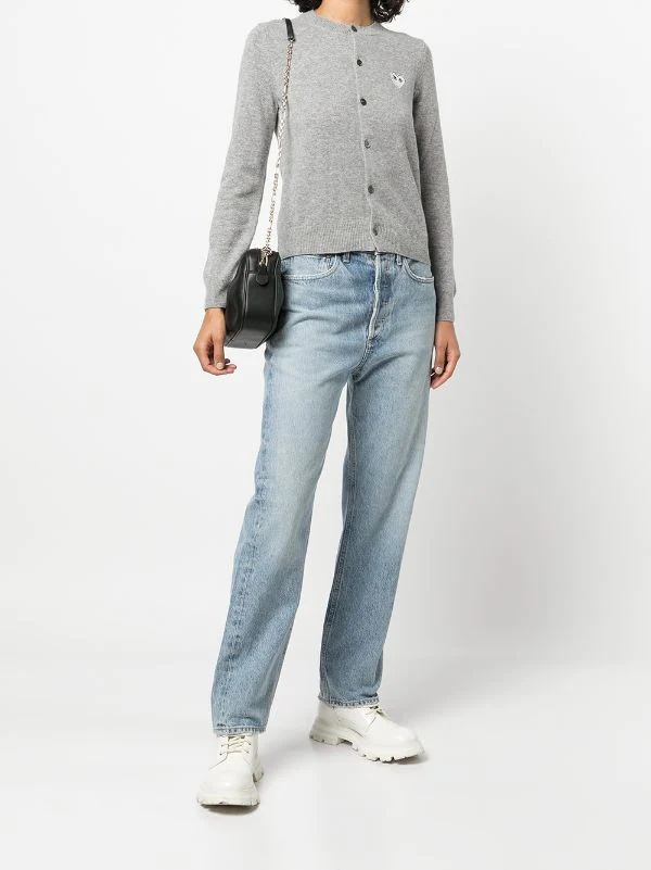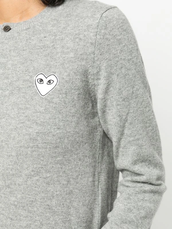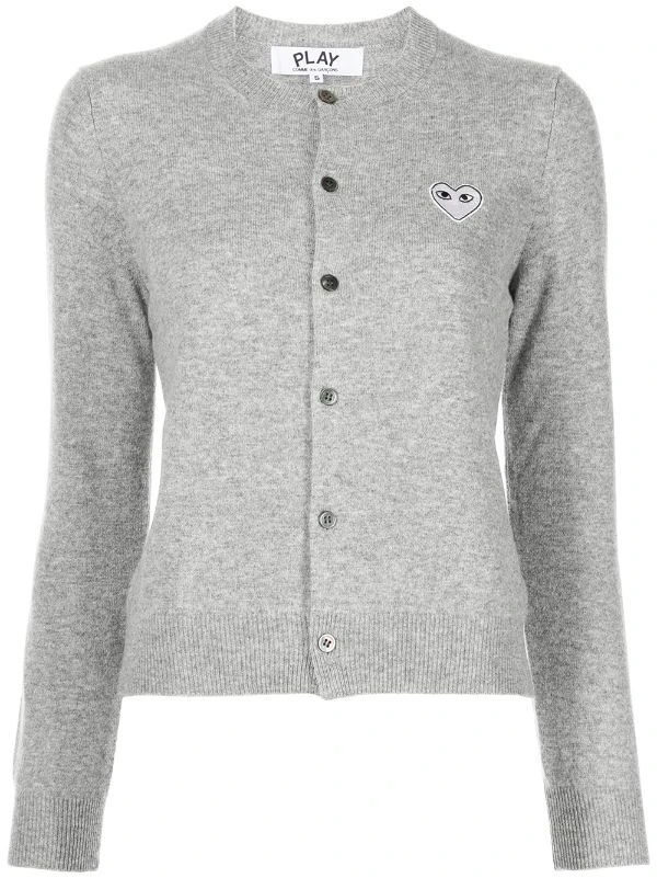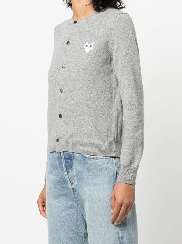 Design en maille, détail nervuré, patch cœur signature, encolure ronde, boutonnière sur le devant, manches longues. Couleur : gris. Matière : laine.