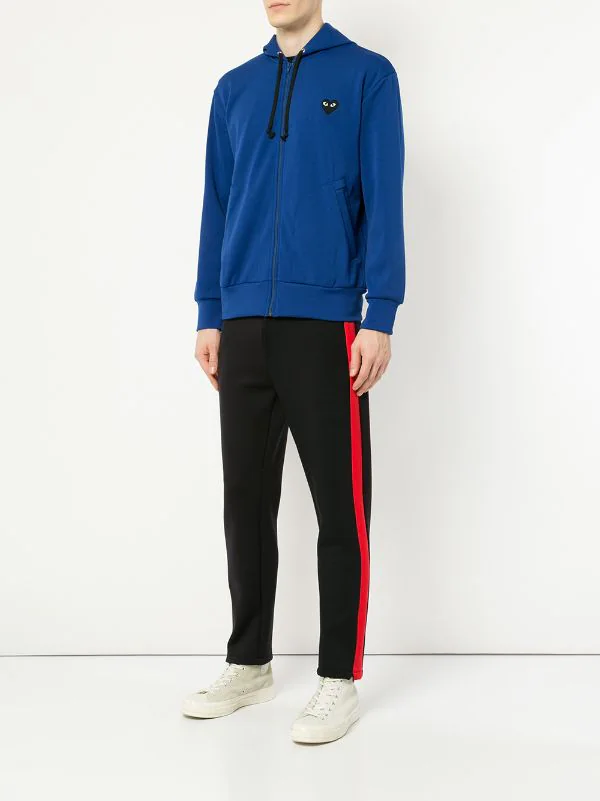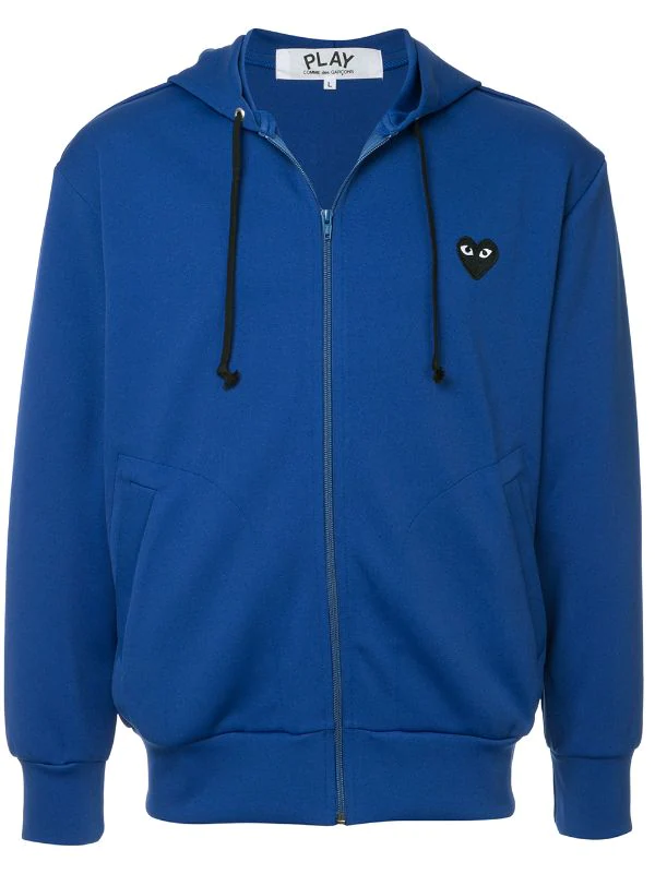 Sweat zippé bleu roi à logo poitrine Comme Des Garçons Play avec capuche à lien de resserrage, fermeture zippée devant, manches longues, ourlet et poignets nervurés, poches latérales fendues, forme détendue et logo du designer brodé sur la poitrine.