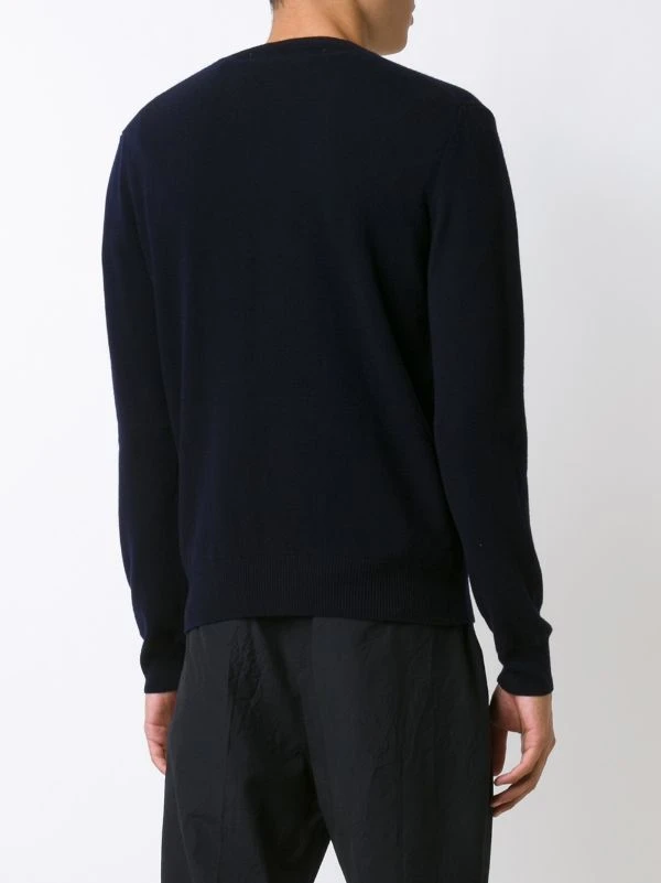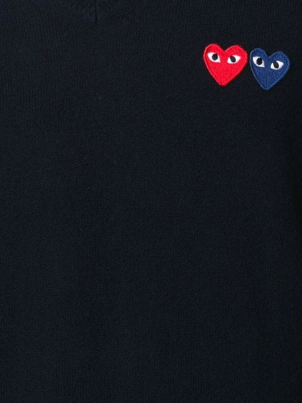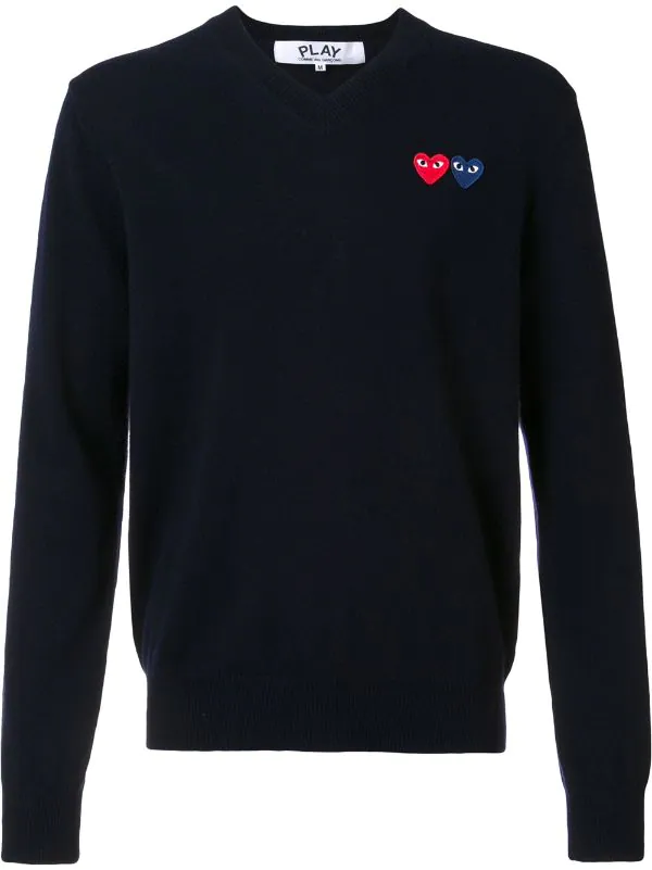 Pull en laine bleu marine à logo patch créateur Comme Des Garçons avec col v.
