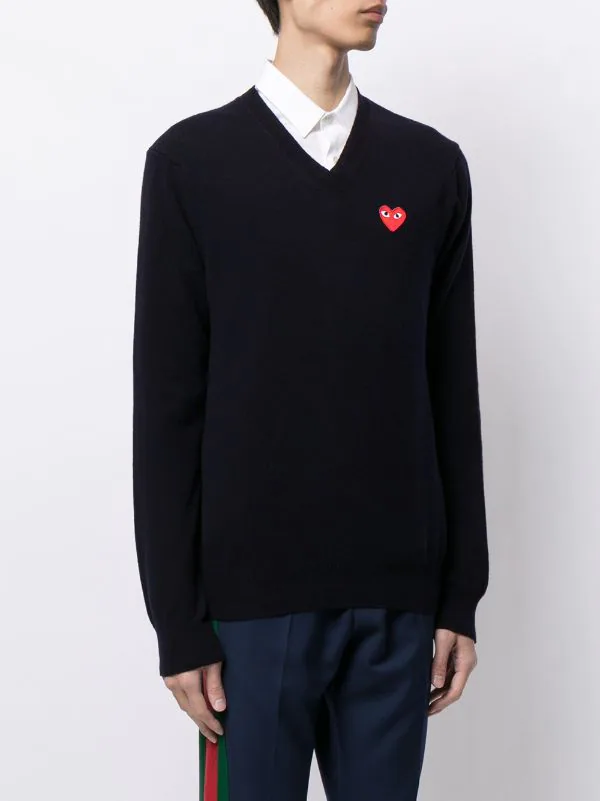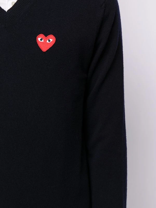 Maille fine, cœur rouge signature brodé, col v, manches longues, ourlet nervuré. Matière : laine.