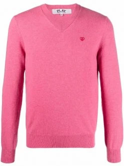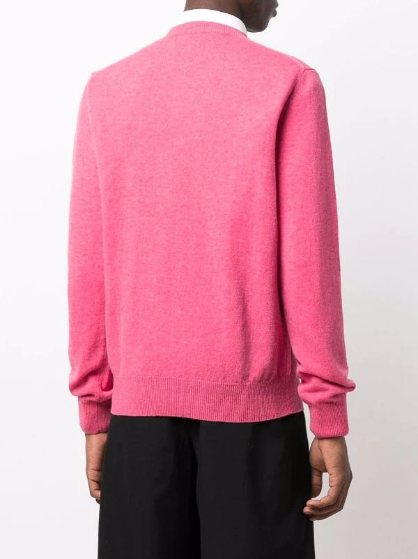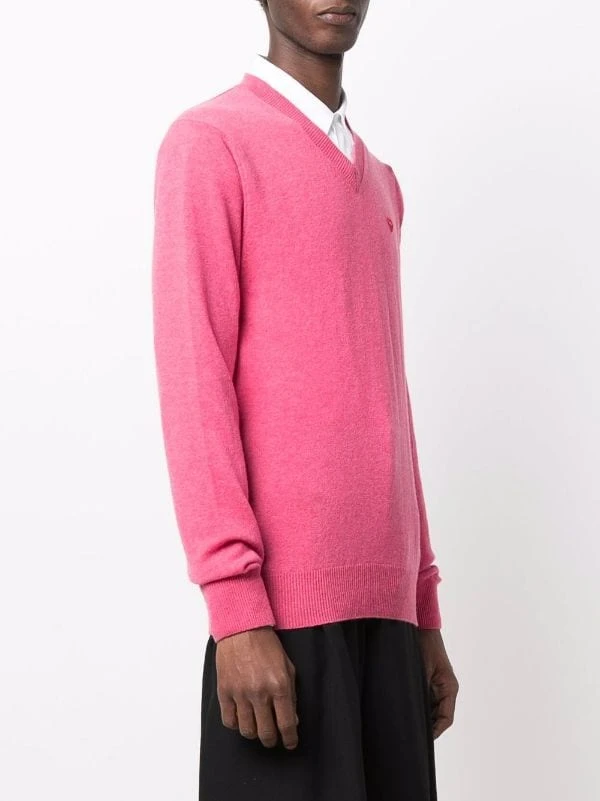 Patch poitrine à logo, manches longues, col v, maille fine. Couleur : rose. Matière : laine.