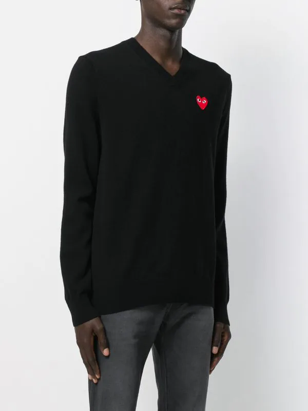Pull à logo en laine Comme Des Garçons Play avec col v, manches longues et logo brodé sur le devant. Couleur : noir.