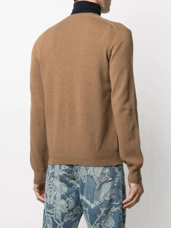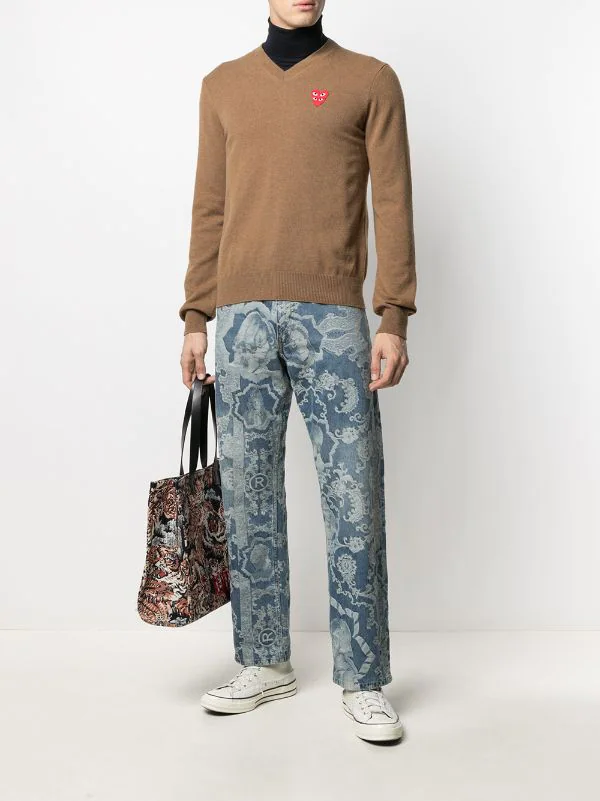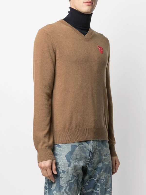 Cœur rouge signature brodé, design tricoté, col v, manches longues, manches à poignets resserrés. Couleur : marron. Matière : laine.
