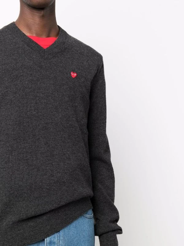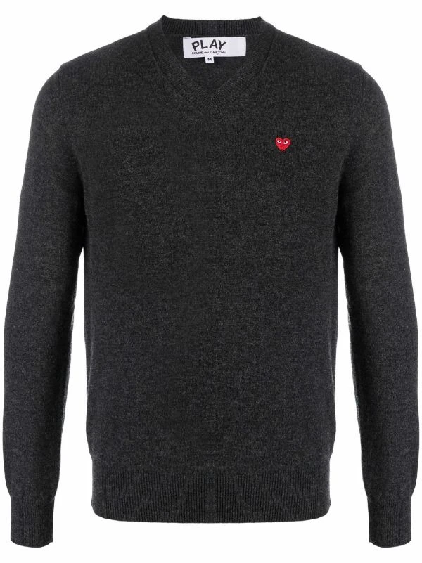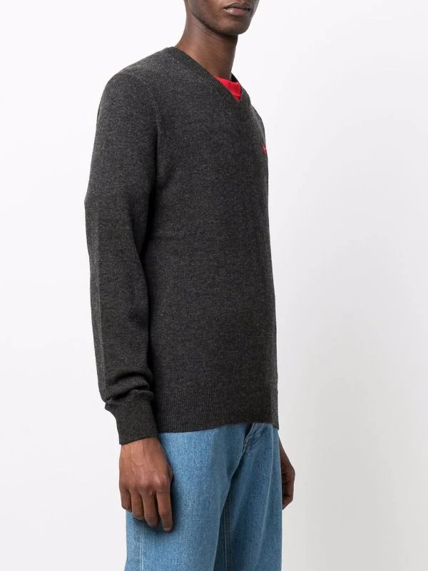 Patch poitrine à logo, manches longues, col v, maille fine. Couleur : gris. Matière : laine.