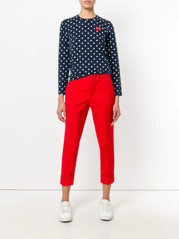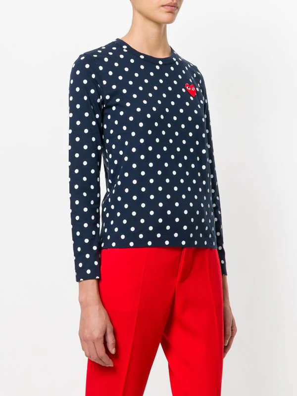 T-shirt en coton bleu marine et blanc à logo cœur brodé Comme Des Garçons Play avec encolure ras du cou, manches longues, ourlet droit et motif à pois.
