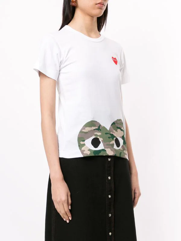 T-shirt à logo imprimé en coton Comme Des Garçons Play avec imprimé camouflage, logo imprimé sur le devant, logo contrastant brodé sur la poitrine, encolure ras du cou, manches courtes et ourlet droit.