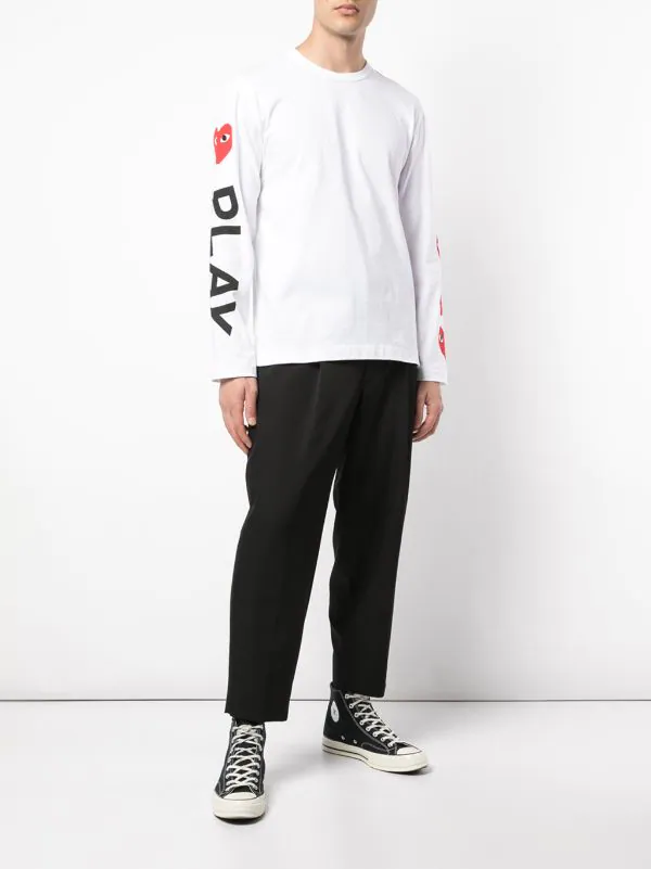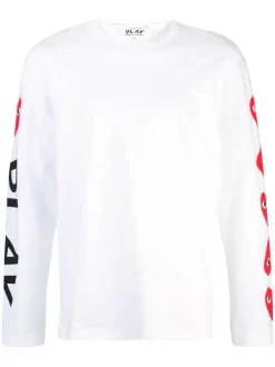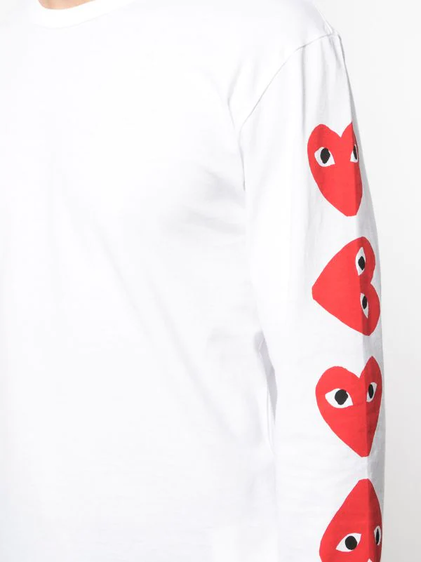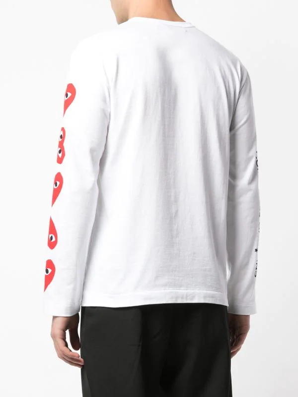 T-shirt imprimé à manches longues en coton Comme Des Garçons Play avec encolure ras du cou, manches longues, forme détendue et ourlet droit. Couleur : blanc.