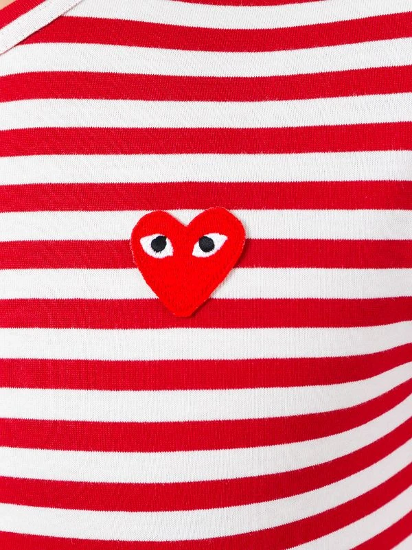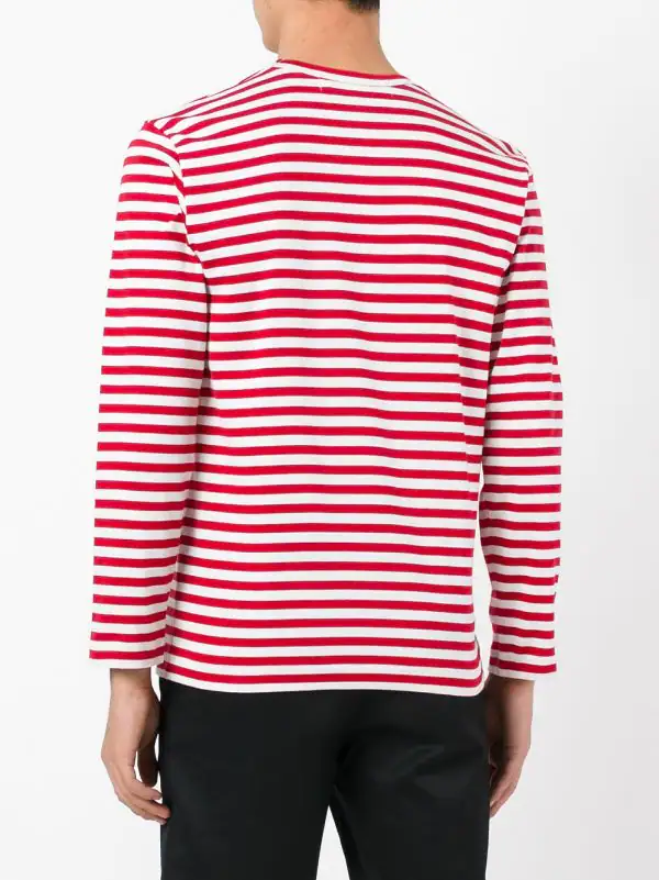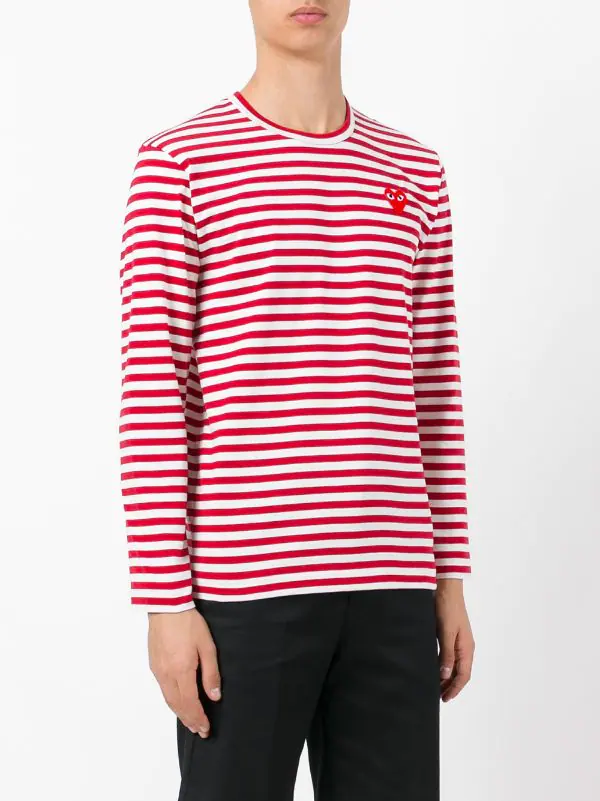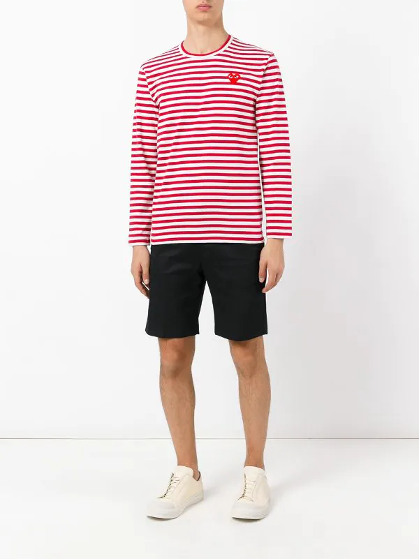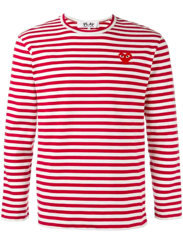 Top en coton rouge et blanc à rayures Comme Des Garçons Play avec encolure ronde, manches longues et logo poitrine.
