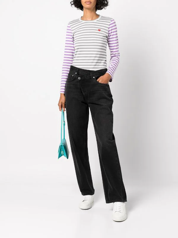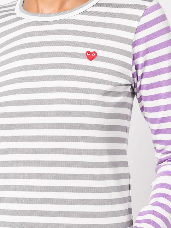 Gris, violet, coton, rayures horizontales imprimées, patch cœur, encolure ronde, manches longues, ourlet droit.